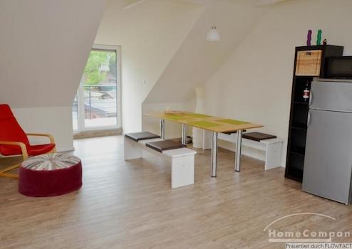 Die Wohnung liegt ruhig Im Stadtrandgebiet von Oldenburg. Über eine außen angebrachte Treppe erreicht man die Wohnung. Die große Fensterfront im Giebel des Hauses läßt viel Licht in die große Wohnküche. Der vordere Teil ist das großzügige Wohnzimmer mit einem separaten Arbeitsplatz, der in eine Nische des Raumes befindet. Der hintere Teil trennt sich in einen Essbereich mit großem Esstisch und dem Küchenteil mit Tresen. Die Küche ist voll ausgestattet. Vom Essbereich gelangt man auf den Balkon. Das Schlafzimmer ist mit einem Doppelbett und einem großem Kleiderschrank ausgestattet. Das Badezimmer hat eine Dusche. Die Wohnung ist perfekt für eine Person oder ein Paar.