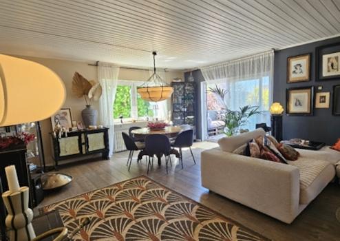 Im 1. Obergeschoss und Dachgeschoss befindet sich eine zauberhafte Maisonettewohnung mit 4-5 Zimmern. Ein geräumiges Wohnzimmer (ca. 35 m²) mit gemütlichem Kamin, tollem Parkettboden und einem herrlich chilligen Balkon, sowie einer Wohnküche wie in Frankreich. Ein weiteres Zimmer, das hervorragend als abschlossenes Büro oder Gästezimmer genutzt werden kann und ein separates Wc stehen ausserhalb der Wohnung auf dieser Etage zur Verfügung. Im Dachgeschoss mit der grossen offenen Dachspitze, befinden sich 3 Schlafzimmer, sowie ein tolles Bad mit Eckwanne. Ein 2. Bad ist hier möglich, aber noch im Rohbau. Insgesamt ca. 116 m² Wohnfläche.