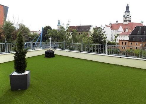 Eine großzügige Dachterrasse mit Blick zur Innenstadt und zum Uhrenturm des Rathauses runden das Angebot ab.