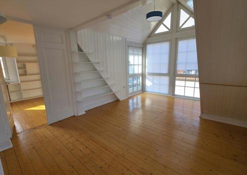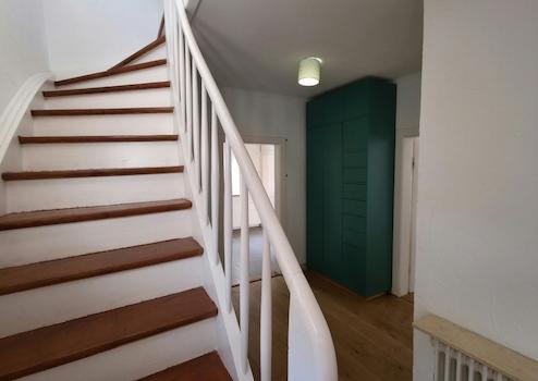 Das Obergeschoss erreichen Sie über eine geschwungene Holztreppe. Dort erwarten Sie zwei lichtdurchflutete Schlafzimmer mit stilvollen Landhausdielen. Die Räume sind durch eine weiße Flügeltür miteinander verbunden. Das größere Schlafzimmer verfügt über ein separates Ankleidezimmer, das zweite über den charakteristischen Erker und direkten Zugang zum Balkon. Ein großzügiges Tageslichtbad mit zwei Waschbecken und Badewanne rundet das Raumangebot auf dieser Etage ab.
