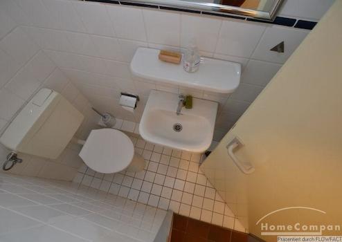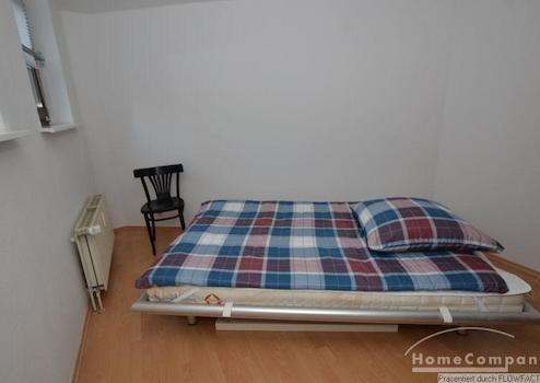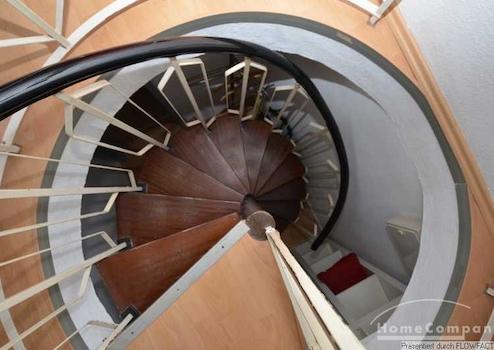 Über eine Wendeltreppe gelangt man ins Untergeschoss. Hier befinden sich das zweite Schlafzimmer und das Bad mit Badewanne. Die Wohnung ist ideal für 2 Kollegen.