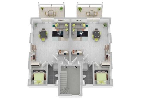 Im lichtdurchfluteten Erdgeschoss befindet sich ein großzügiger offener Wohn-/ Essbereich. Von hier aus gelangen Sie auf die gemütliche Terrasse oder den Balkon.
