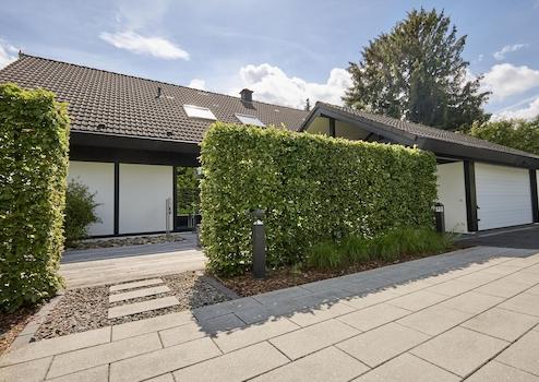 Das Grundstück umfasst 1845 QM und hat eine leichte Hanglage. Der nach Süden ausgerichtete Garten ist parkähnlich gestaltet, pflegeleicht und uneinsehbar. Neben der großen Holzterrasse gibt es ein kleines verstecktes Rondell für den Nachmittagskaffee.