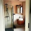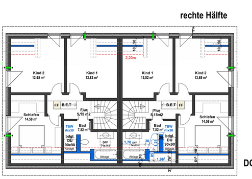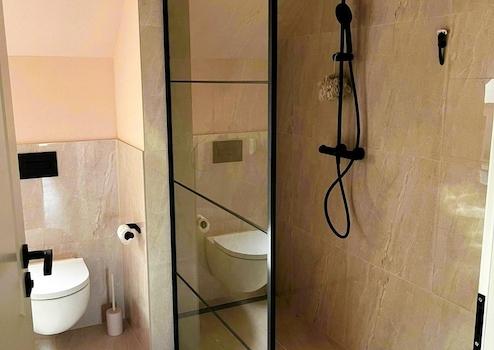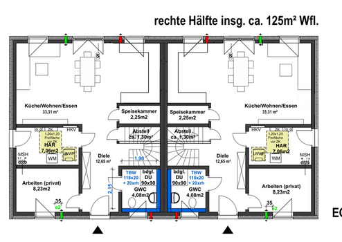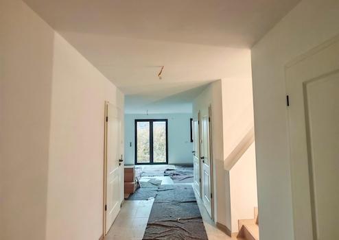Im Erdgeschoss befindet sich ein großzügiger Wohn- und Essbereich mit offener Küche, eine Speisekammer, ein Arbeitszimmer sowie ein Gäste-WC mit Dusche. Das Obergeschoss bietet zwei Kinderzimmer, ein Schlafzimmer mit angrenzender Ankleide sowie ein hochwertig ausgestattetes Badezimmer mit Dusche. In beiden Geschossen ist jeweils eine Dusche vorhanden.