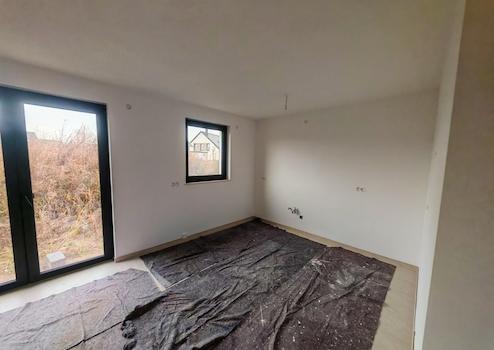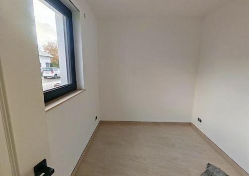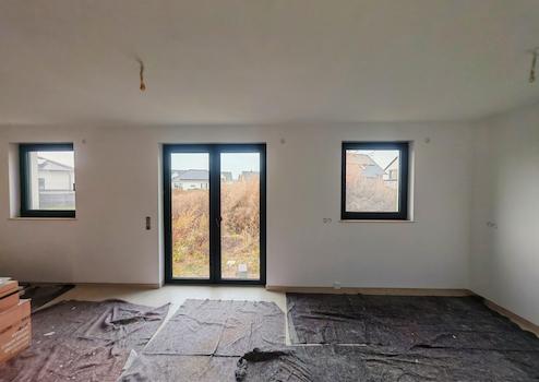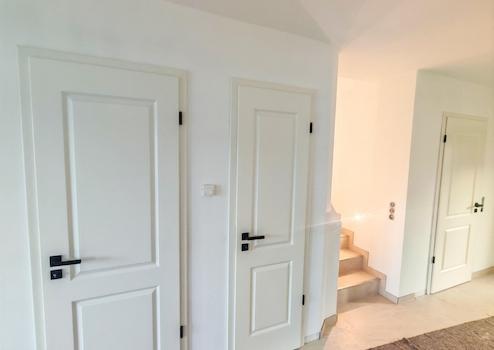 Besonders hervorzuheben sind die modernen Fenster: Es wurde überwiegend auf bodentiefe, dreifach verglaste Fenster gesetzt, um den Wohnkomfort durch mehr Tageslicht zu steigern. Alle Fenster sind mit elektrischen Jalousien ausgestattet und in elegantem Schwarz (innen und außen) ausgeführt. Die Hauseingangstür ist in Aluminium-Kunststoff, die Nebeneingangstür in robustem Kunststoff, ebenfalls in Schwarz gefertigt.