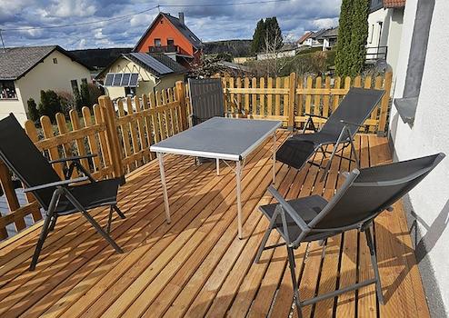 Großzügiger Balkon (18 m²) aus Douglasienholz mit Blick ins Grüne