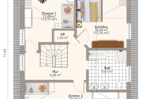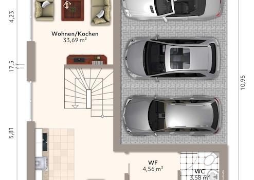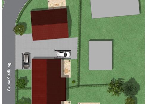 Straßenbegleitend ist ein kleines Einfamilienhaus mit integrierten PKW-Stellplätzen und einer Wohnfläche von ca. 105 m² für eine dauerhafte Wohnnutzung vorgesehen.