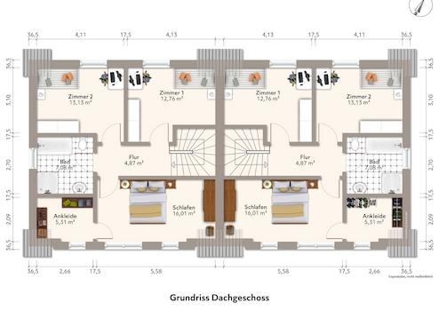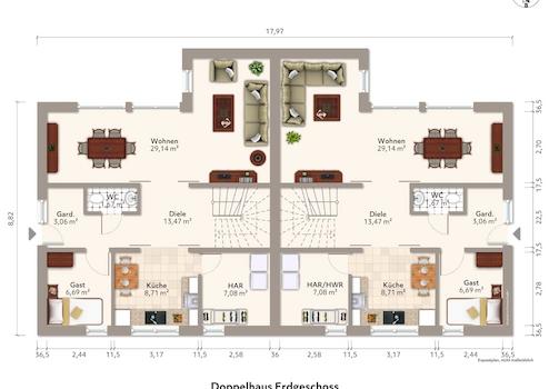 Das Doppelhaus beherbergt 2 Wohneinheiten mit jeweils 123,5 m² Wohnfläche und darf nur zu Dauerwohnzwecken errichtet werden.
