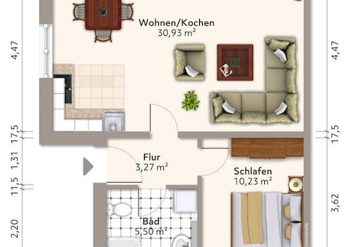 Die knapp 49,93 m² Fläche verteilen sich auf 2 Räume und sind ein idealer Rückzugsort für Paare, die ebenerdiges Wohnen bevorzugen.