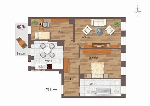 Die ca. 87 m² große Wohnung überzeugt mit einer durchdachten Raumaufteilung: Ein einladender Flur führt in sämtliche Zimmer der Wohnung. Die separate Küche bietet nicht nur Platz für einen Essbereich, sondern auch direkten Zugang zum hofseitig gelegenen Balkon – ein geschützter Ort zum Entspannen im Grünen. Das helle Tageslichtbad ist mit einer Badewanne ausgestattet. Neben dem gemütlichen Schlafzimmer und einem großzügigen Wohnzimmer steht ein weiteres Zimmer zur Verfügung, das sich ideal als Kinder-, Gäste- oder Arbeitszimmer eignet.