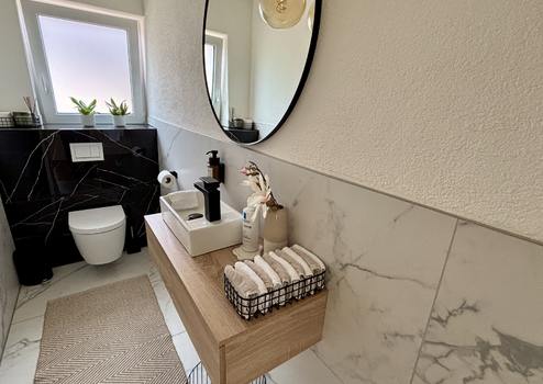 Im Erdgeschoss befindet sich ein großzügiger Wohn-/ Essbereich mit einer offenen Küche und großen lichtdurchflutenden Fenstern, ein Schlafzimmer, das neue Bad mit Badewanne und Dusche und ein Gäste-WC.