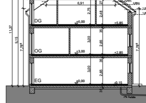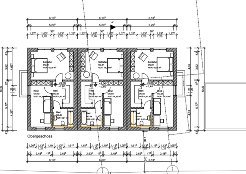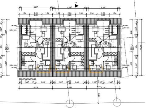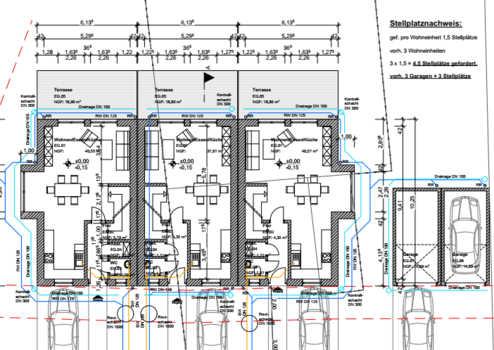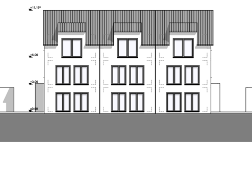 Die genehmigte Planung sieht drei gut aufgeteilte Einfamilienhäuser mit ausgebautem Dachgeschoß in Reihenhausbauweise vor. Die Wohnfläche beträgt jeweils ca. 145 m².