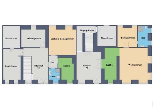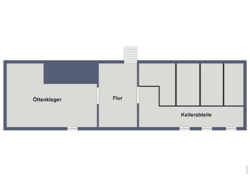 Die rechte Haushälfte ist unterkellert. Im Keller befinden sich der Öltank und die zu den Wohneinheiten gehörigen Kellerabteile. Im EG gibt es einen großen Eingangsbereich und die Zugänge zur kleinen 2RWE sowie der großen 2RWE, welche sich über das 1. OG der rechten Haushälfte erstreckt.
