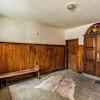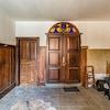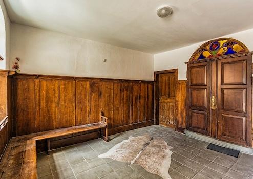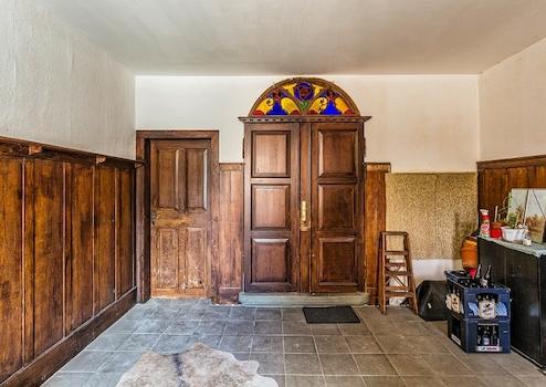 Das helle Treppenhaus links besitzt einen Fliesenboden und ist weiß gestrichen. Der geflieste Vorraum im Hauseingang rechts ist mit einer antik anmutenden Holz-Wandvertäfelung und einer Sitzbank ausgestattet.
