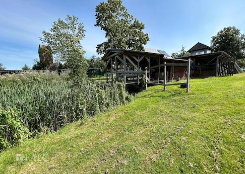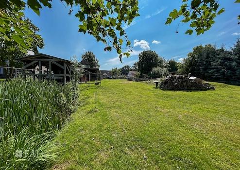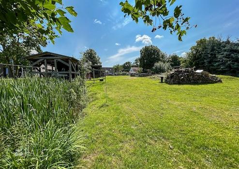 Im Zentrum des Grundstücks befindet sich ein malerischer Teich, der den natürlichen Reiz der Fläche unterstreicht. Direkt am Wasser wurde ein kleines Holzhaus mit Terrasse errichtet – ein stiller Rückzugsort mit direktem Blick auf das Teichufer. Dieses Ensemble bildet den gestalterischen und funktionalen Mittelpunkt des Anwesens und macht das Grundstück bereits jetzt nutzbar, sei es zur Naherholung, als Wochenenddomizil oder als Ausgangspunkt für eine spätere Bebauung.