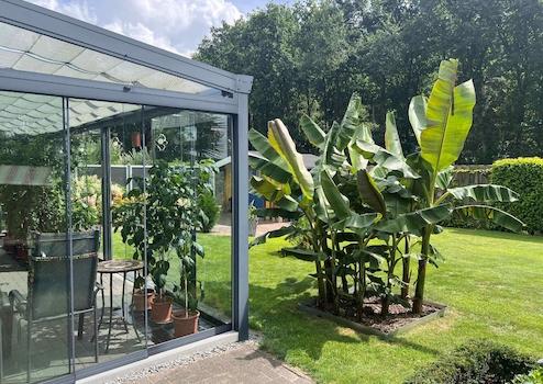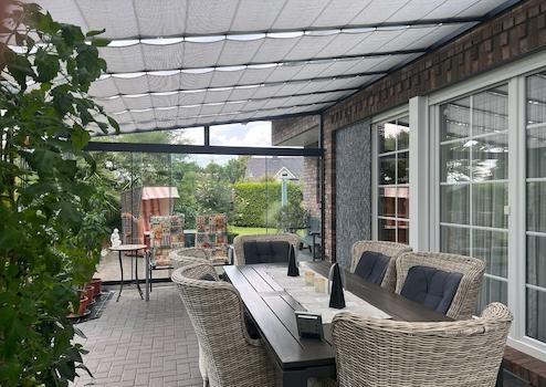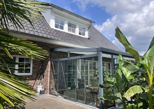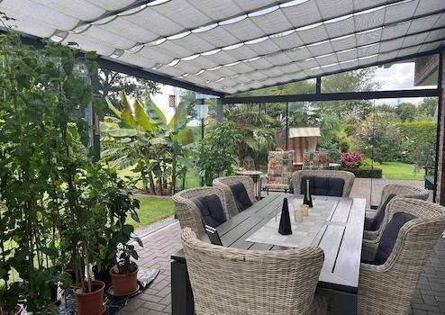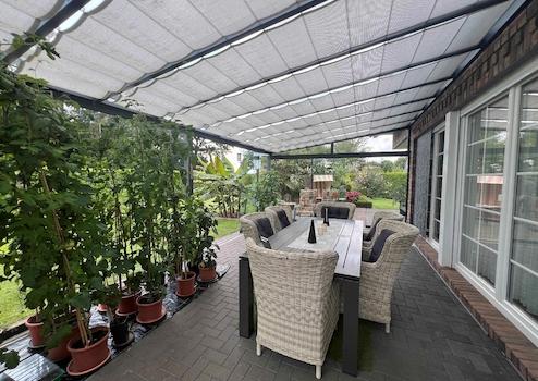 Überdachter Sommergarten – eine einladende Erweiterung des Wohnraums, die sich wetterunabhängig nutzen lässt. Hier können Sie geschützt vor Wind und Regen frühstücken, Feste feiern oder einfach bei einem Glas Wein den Sonnenuntergang genießen.