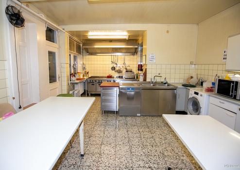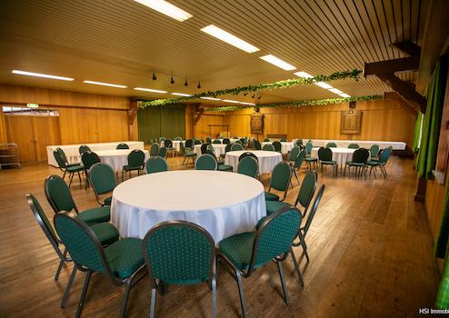 Im 1. Obergeschoss befindet sich ein großer Saal mit Bühne, der durch einen Lastenaufzug aus dem Erdgeschoss beliefert werden kann.