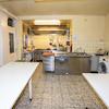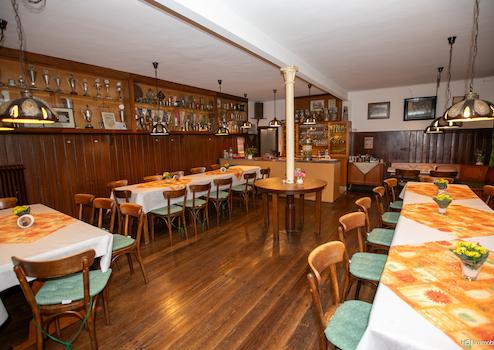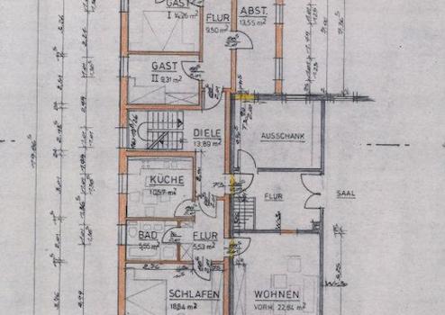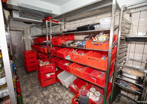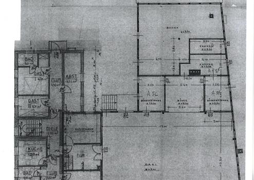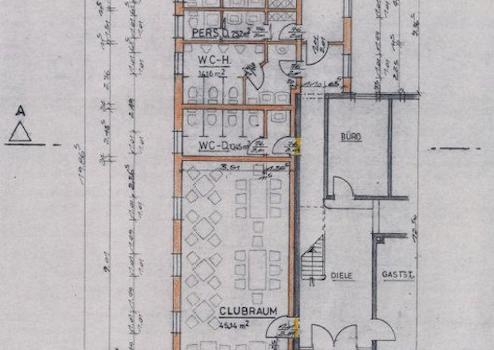 Dazu gehörenden im Erdgeschoss ein Büro, eine Gaststätte mit Clubraum, Sozialräume, eine ehemalige Schlachterei mit Kühlraum und Ladengeschäft.