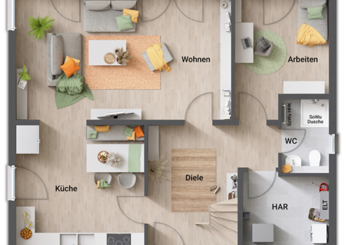Ihr Haus wird schlüsselfertig übergeben, d.h. Sie gestalten nur noch die Innenwände in Ihrer Lieblingsfarbe und verlegen die übrigen Bodenbeläge!