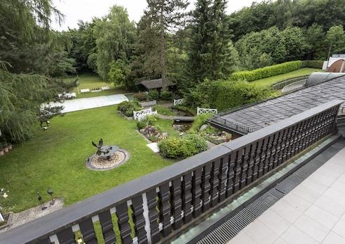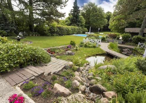Der gepflegte, weitläufige Garten besticht durch eine dichte umlaufende Bepflanzung, die maximale Privatsphäre schafft. Neben einem gärtnerisch angelegten Bereich mit Zierteich verfügt das Grundstück über einen beheizten Außenpool mit einer Größe von ca. 11 mal 5,5 Metern, der mit einer aufschiebbaren Überdachung ausgestattet ist.