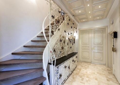 Geschosstreppen: Gewendelte Holztreppe mit Echtholzstufen mit Teppich belegt, Natursteintreppe zum Kellergeschoss, jeweils mit edlem schmiedeeisernen Schmuckgeländer