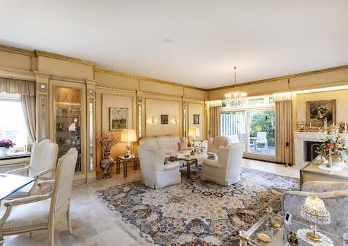 Die ca. 235 m² große Hauptwohnung teilt sich wie folgt auf: Zur linken Seite des Eingangs liegen zwei großzügige Wohnräume: eine elegante Bibliothek mit ca. 44 m² Fläche und ein angrenzendes ca. 54 m² großes Wohnzimmer, das durch große bodentiefe Fensterflächen einen herrlichen Blick in den rückwärtigen Garten eröffnet. Das ca. 40 m² große Esszimmer liegt zentral im Erdgeschoss und ist sowohl mit der Bibliothek als auch mit dem Wohnzimmer und der Küche verbunden. Vom Esszimmer aus gelangen Sie auf die teilüberdachte Terrasse, die zum Verweilen im Freien einlädt und direkt an den wunderschön angelegten Garten anschließt. Über eine Zwischendiele ist das ca. 34 m² große Schlafzimmer mit angrenzendem Tageslichtbad erreichbar. Neben einem herrlichen Ausblick können Sie auch vom Schlafzimmer aus direkt in den Garten gelangen.