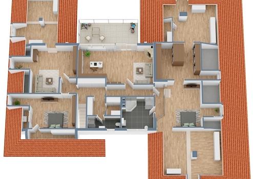 Im großzügig ausgebauten Dachgeschoss stehen Ihnen ca. 167 m² zusätzliche Wohnfläche zur Verfügung. Hier befinden sich drei weitere Schlafzimmer, eines davon mit einem direkt angeschlossenen Tageslichtbad, ein separates Gäste-WC mit Fenster sowie ein sehr großzügiger Wohnbereich mit großer bodentiefer Fensterfront. Von hier aus gelangen Sie auf die etwa 21 m² große Loggia, die einen herrlichen Blick ins Grüne bietet und den Wohnkomfort dieser Etage nochmals unterstreicht.