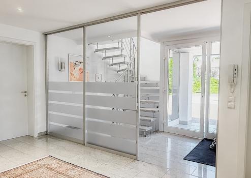 Der nördliche Eingang öffnet das Entrée mit Windfang und Treppenhaus und schafft eine Verbindung zwischen allen Etagen. Von hier aus gelangen Sie durch eine Glastür in den geräumigen Hauptflur. Links liegt die in weiß gehaltene Landhausküche, die mit hochwertigen Elektrogeräten und Granitplatten ausgestattet ist. Ein Durchgang führt von der Küche zum Esszimmer. Durch die Split-Level-Architektur zwischen den Räumen erfolgt eine klare, aber fließende Trennung der Bereiche und sorgt für eine beeindruckende Raumwirkung. Der hochwertige Granitboden, die abgehangenen Decken mit indirekter Beleuchtung u. die maßgeschneiderten Einbauschränke, die sich einheitlich durch den gesamten Bereich ziehen, unterstreichen den exklusiven Charakter des Hauses.
