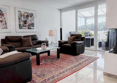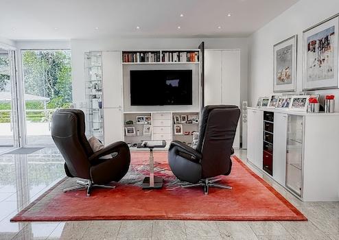 Das rund 47 m² große Wohnzimmer ist nach Süden ausgerichtet u. hat im Zentrum des Raumes einen integrierten Panoramakamin mit angrenzender Bücherwand, der den Raum optisch gliedert u. eine Trennung zum angrenzenden Fernsehzimmer schafft. Vor beiden Räumen ist ein hochwertiger Wintergarten verbaut, mit großflächigen zu öffnenden Echtglaselementen. Dies ermöglicht einen Rundumblick in die grüne Landschaft. Der Wintergarten ist mit einer effektiven Beschattungsanlage ausgestattet und verfügt über einen Außenkamin.