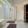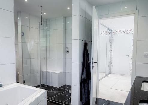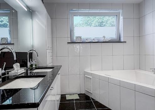 Der im Süden liegende Schlafbereich bietet einen weiten Blick in den Südgarten. Zum Schlafzimmer gehören eine separate Ankleide mit maßgefertigten Einbauschränken für ausreichend Stauraum und ein privates Badezimmer mit ebenerdiger Dusche, Bidet, Urinal, Doppelwaschtisch sowie eine Eckbadewanne mit Whirlpool-Funktion. Ein über 20 m² großes Büro auf der Nordseite im Erdgeschoss kann auch als Schlafzimmer genutzt werden.