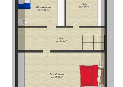 Die zweite Einheit wurde 1990 errichtet, erstreckt sich über zwei Etagen und bietet zusätzlich einen ausgebauten Keller mit ca. 60 m² Nutzfläche – perfekt für ein Büro, Gäste oder als Rückzugsort.