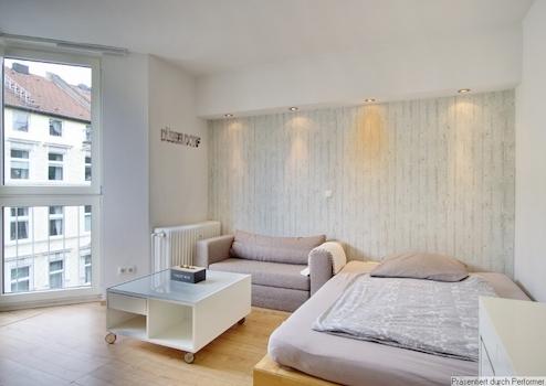 Hier können Sie auf der Couch entspannen und gemütlich TV sehen, ein eigener Bereich mit einer komplett ausgestatteten Küchenzeile und Esstisch kombiniert Kochen und Essen, ein Schreibtisch kann als Homeoffice und Arbeitsplatz genutzt werden und ein hochwertiges Bett sorgt für einen gesunden Schlaf. Durch bodentiefe Fenster und einen französischen Balkon erhält das Apartment viel Charme.