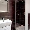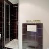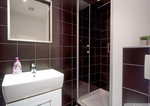 Das neuwertige Badezimmer ist mit einer Dusche ausgestattet.