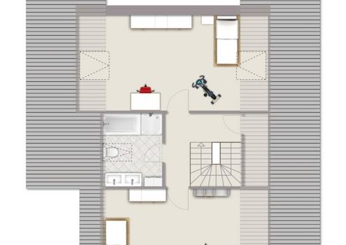 Das Dachgeschoss bietet auf 54 m² Wohn-/Nutzfläche einen Flur, ein Vollbad und zwei sonnige und großzügige Zimmer.