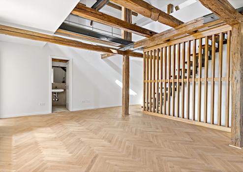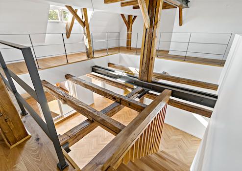 Bereits der Eingangsbereich im 1. Obergeschoss vermittelt Exklusivität. Von hier führt eine stilvolle Holztreppe direkt in den Hauptbereich der Wohnung – hell, offen und geprägt von einer einzigartigen Raumwirkung. Das großzügige Wohnzimmer mit offener Küche bildet das Herzstück und begeistert durch die sichtbaren Holzbalken und stilvollen Holzelemente, die eine warme und zugleich moderne Atmosphäre schaffen. Ein angrenzender Balkon lässt sich durch aushängende Fenster zum geschützten Wintergarten verwandeln – ein echtes Highlight für alle Jahreszeiten.