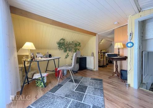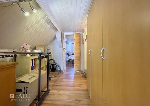 Eine Treppe führt ins ausgebaute Dachgeschoss, wo sich ein weiteres Schlafzimmer befindet.