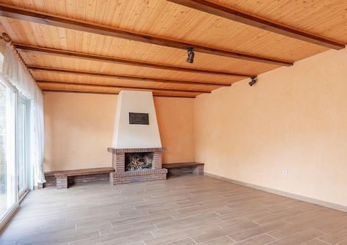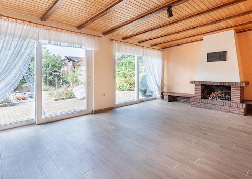 Das attraktive Kaminzimmer öffnet sich nach Westen hin über zwei große Schiebetüren und gewährt Ihnen einen schönen Ausblick ohne Vis-a-Vis. Ein ansprechender, offener Kamin vermittelt ein angenehmes Wohngefühl.