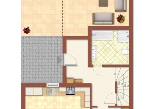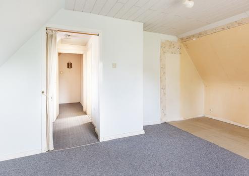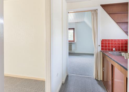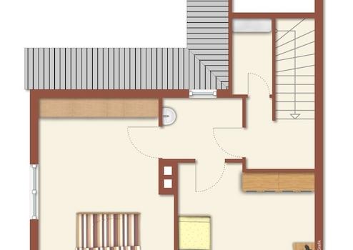 Über eine Holztreppe erreichen Sie das Dachgeschoss. Hier befinden sich das Kinderzimmer und das große Schlafzimmer sowie ein kleiner Vorflur mit Kochnische und eine zusätzliche Abseite, die Platz für Stauraum bietet.