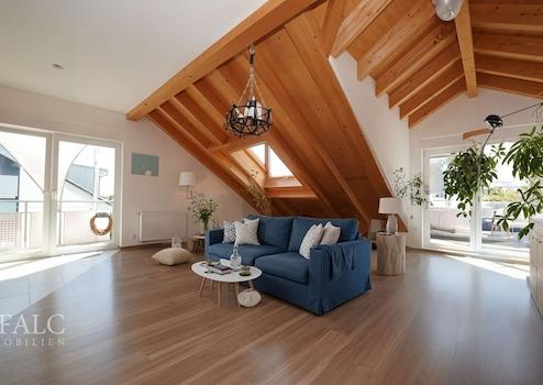 Über das Treppenhaus erreichen Sie das Dachgeschoss, in dem sich die Wohnung befindet. Bereits beim Eintreten wird man von einem großzügigen, lichtdurchfluteten Wohnbereich empfangen. Auf rund 40 m² bietet dieser Raum ausreichend Platz für eine gemütliche Wohnlandschaft, einen großen Esstisch sowie eine offene, moderne Einbauküche, die im Kaufpreis inbegriffen ist. Die großzügige Gestaltung verleiht dem Raum eine angenehme Offenheit und lädt zum Verweilen ein.