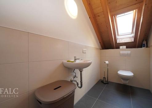 Rechts vom Eingangsbereich befinden sich die weiteren Räume der Wohnung. Das moderne Tageslichtbad in Holzoptik verfügt über Dusche, WC, Waschbecken sowie einem Waschmaschinenanschluss – ein echtes Plus im Alltag. Gegenüber befindet sich ein separates Gäste-WC, was insbesondere bei Besuch zusätzlichen Komfort bietet. Ein praktischer Abstellraum rundet den funktionalen Bereich ab und bietet Stauraum für Vorräte, Haushaltsgeräte oder Reinigungsmittel.