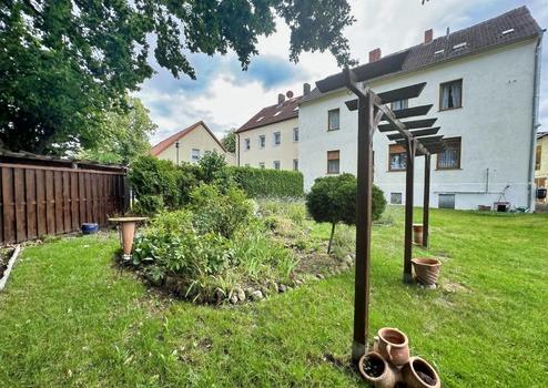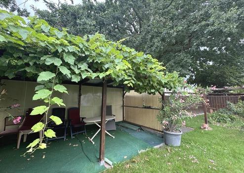 - Garten mit überdachter Sitzecke und angelegten Beeten