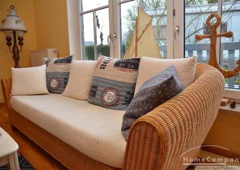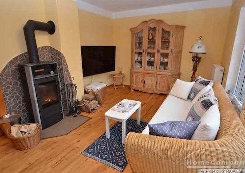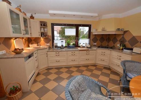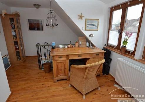 Stilvoll Wohnen auf dem Lande. Das gesamte Haus mit Echtholzparket ist geschmackvoll im Landhausstil eingerichtet. Badezimmer, Küche und Diele verfügen über eine Fußbodenheizung. In der vollausgestatteten Küche bleibt kein Wunsch offen. Am Runden Tisch ist für maximal 8 Personen Platz. Der Kaminofen im gemütlichen Wohnzimmer sorgt für Wärme und eine angenehme Atmosphäre. Vom Wohnzimmer gelangt man auf die Terrasse und den großen Bauerngarten. Ein Gästezimmer ermöglicht die Nutzung einer Familie oder 2 Kollegen. Das Badezimmer verfügt über eine Dusche mit Sitzfunktion und eine Badewanne. Im Obergeschoß befindet sich ein Arbeitsplatz auf dem Flur und das Schlafzimmer mit einem Doppelbett. Die Wohnung ist perfekt für ein Paar auch mit Kind.