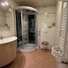 - Badezimmer aus den 1990er Jahren mit Dusche, WC und Waschbecken