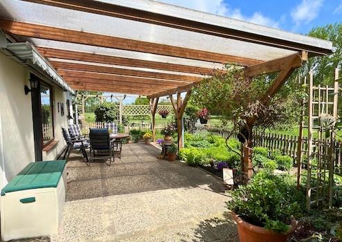 - Terrasse mit Blick auf die angrenzenden Wiesen