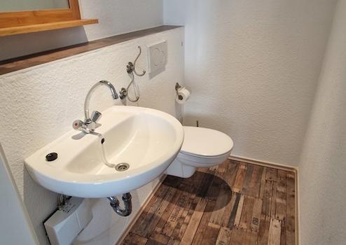 saniert, ca. 32 m², zwei Zimmer, Fenster in Dreifachverglasung, WC mit Waschbecken, zusammen mit der Wohnung im Haupthaus seit 2023 vermietet.