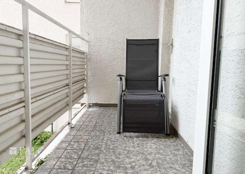 Zur Wohnung gehören ein Schlafzimmer, ein Wohnzimmer, zwei Balkone sowie Küche und Bad. Zur weiteren Ausstattung gehört ein Kellerraum im Untergeschoss.
