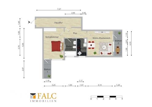 Die Wohnung verfügt über zwei Balkone. Diese erreichen Sie über das Schlafzimmer und einmal über das geräumige Wohnzimmer, wo Sie auch Ihren Essbereich einrichten können. Vom zentralen Flur gelangen Sie in allen Räumen.