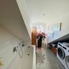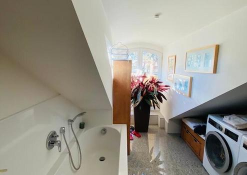 Tageslicht-Badezimmer mit Badewanne, großer Dusche und Waschmaschine mit Trockner.