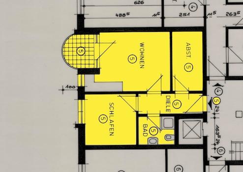 Diele, Wohnzimmer mit Anschlüssen für die Küchenzeile, Balkon, gr. Abstellraum, Dusche-Bad/WC, Schlafzimmer. Wohnfläche ca. 44,46 m². Wäsche-Trockenboden im Haus, Gemeinschafts- Fahrradraum, Kfz-Stellplatz.