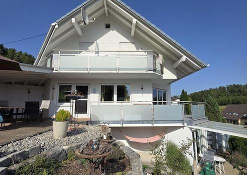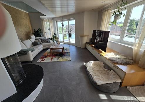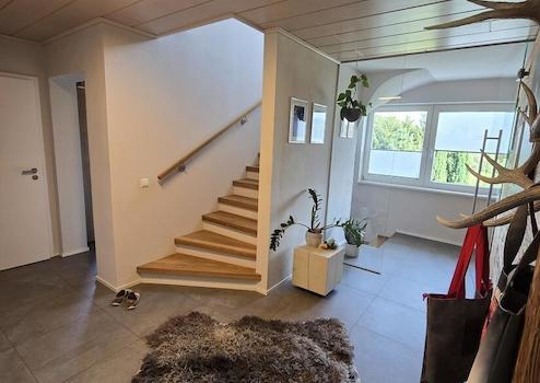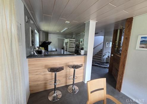 In schönem Ambiente empfangen Sie Ihre Gäste im Eingangsgeschoss und kommen über die Treppe direkt in die stilvolle Wohnetage. Hell und freundlich präsentiert sich der offene Wohnbereich mit herrlichem Blick übers Tal in die Natur und dem eigenen Garten. Die Küche mit separater Speisekammer ist gut geschnitten und trennt Sie nur durch einen Tresen vom Esszimmerbereich, so können Sie sich auch als kochender Gastgeber stets mit Ihren Freunden und Bekannten unterhalten. Zugang in den traumhaften Garten hat man über den Balkon über das Wohnzimmer oder direkt über die Terrasse vom Essbereich. Ein Büro sowie das Gäste-WC runden diese Etage ab.